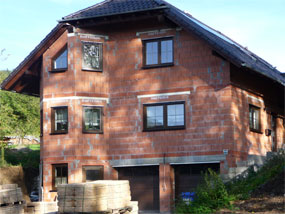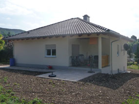 Zweifamilienwohnhaus ohne Keller im Bungalowstiel in Steinfeld Ausgeführte Arbeiten: Rohbau, Erdbau, Kanalarbeiten, Trockenbauarbeiten, Fliesenarbeiten
