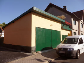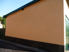Putzarbeiten farblich abgesetzt an einen Garagenanbau in Rauenstein, Sockelausführung mit Granitfliesen