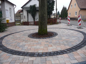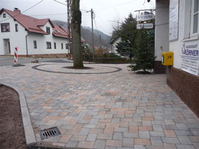 Betonpflaster von Rinn in einer Garagen-einfahrt verlegt, Randbegrenzung als Pflasterzeile mit Granitsteinen ausgebildet